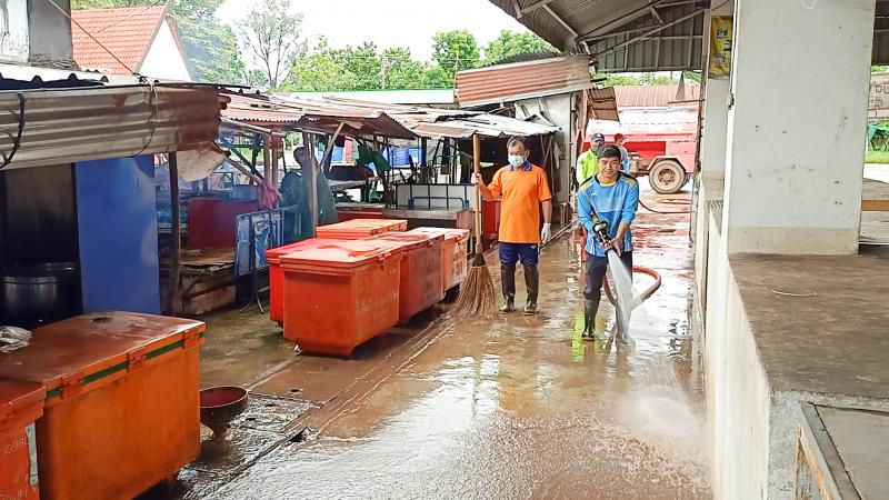 กองสาธารณสุขและสิ่งแวดล้อม ร่วมกับฝ่ายงานป้องกันฯ ฉีดล้างทำความสะอาดตลาดสดเทศบาล เพื่อสุขอนามัย