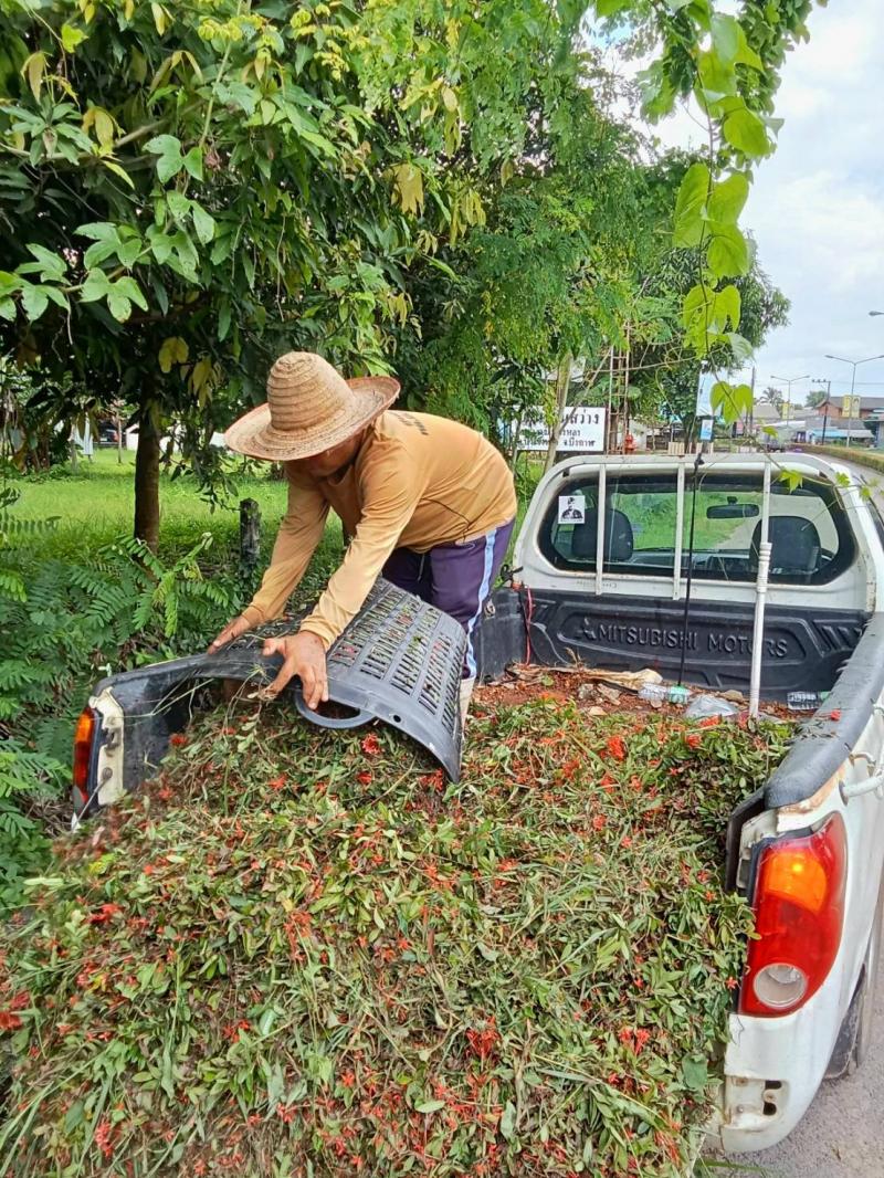 ตัดหญ้าและกำจัดวัชพืช พร้อมเก็บกวาดบริเวณเกาะกลางถนน