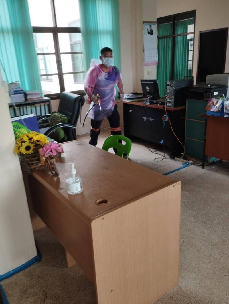 เจ้าหน้าฝ่ายงานป้องกันและบรรเทาสาธารณภัย เทศบาลตำบลบึงโขงหลง ดำเนินการฉีดพ่นสารเคมี เพื่อกำจัด "ไร" จากนกพิราบที่มาอาศัยทำรังบนฝ้าเพดานของสำนักงานและ บริเวณโดยรอบภายในสำนักงานเทศบาลฯ