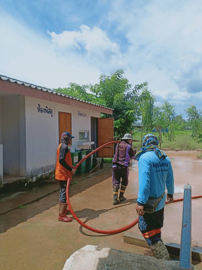 ฝ่ายงานป้องกันนำรถน้ำเข้าสนับสนุน ฉีดล้างทำความสะอาดโรงฆ่าสัตว์ หลังจากมีการขุดลอกทางระบายน้ำแล้ว ร.ต.ท. วสันต์ ชัยลา นายกเทศมนตรีฯ ลงพื้นที่ดูความเรียบร้อย
