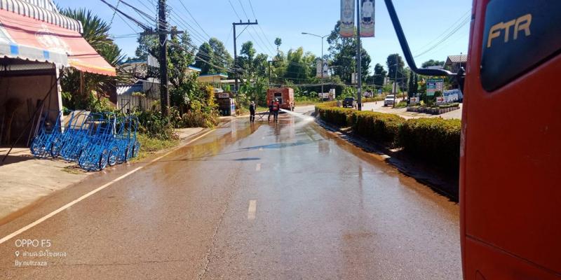 ฝ่ายงานป้องกันฯ นำรถน้ำฉีดล้างทำความสะอาดถนนช่วงบริเวณหน้าปั๊มน้ำมันเจริญรัตน์