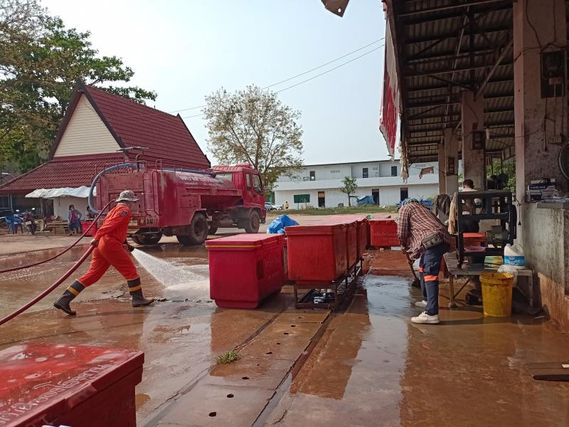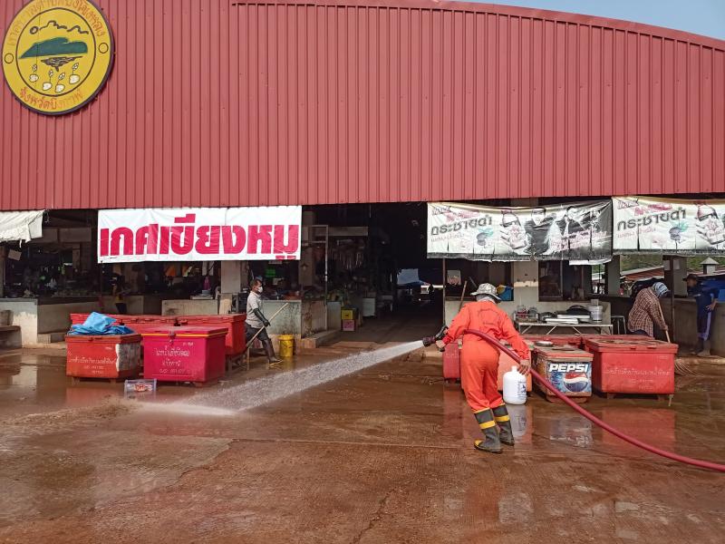 งานป้องกันฯและงานสาธาฯ เทศบาลตำบลบึงโขงหลง ฉีดล้างทำความสะอาดตลาดสดเทศบาล