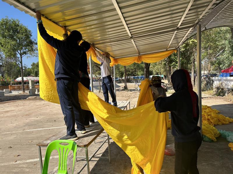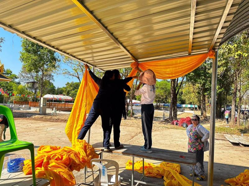 ร.ต.ท.วสันต์ ชัยลา นายกเทศมนตรีตำบลบึงโขงหลง มอบหมายให้ คณะครูฯ พนักงาน และลูกจ้างเทศบาลตำบลบึงโขงหลง ผูกผ้าประดับเต็นท์ เพื่อเตรียมพร้อมในการจัดงานพิธีบวงสรวงพญานาค ไหว้ปู่อือลือ (บุญเดือนสาม) ประจำปี 2566