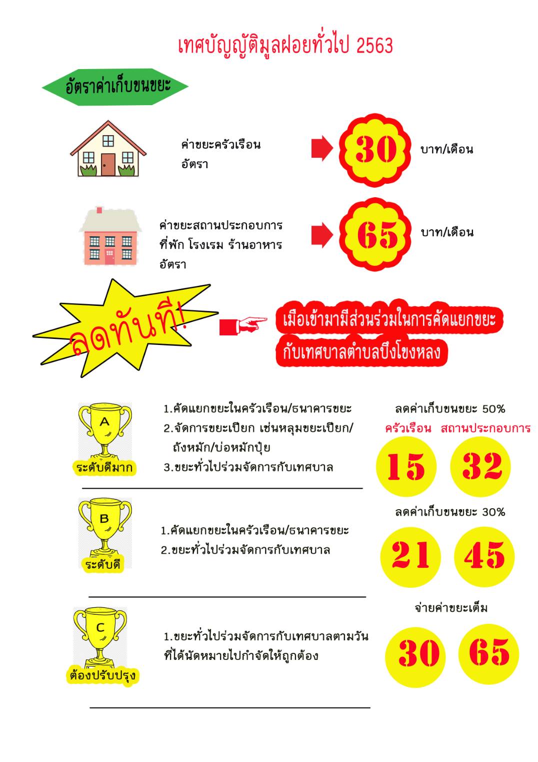 รายละเอียด : เทศบาลตำบลบึงโขงหลง ขอประชาสัมพันธ์ การบริหารจัดการขยะมูลฝอย ตามเทศบัญญัติมูลฝอยทั่วไป 2563 การบริหารจัดการขยะต้นทางแบบมีส่วนร่วมกับเทศบาลตำบลบึงโขงหลง เพื่อให้ชุมชนมีส่วนร่วมในการจัดการขยะอย่างเป็นระบบ พร้อมจัดระบบจัดเก็บค่าขนขยะมูลฝอย