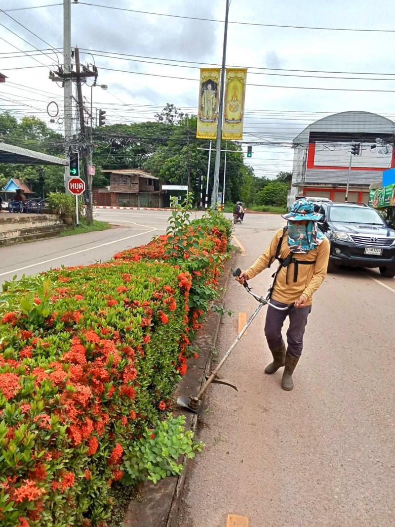 ตัดหญ้าและกำจัดวัชพืช พร้อมเก็บกวาดบริเวณเกาะกลางถนน