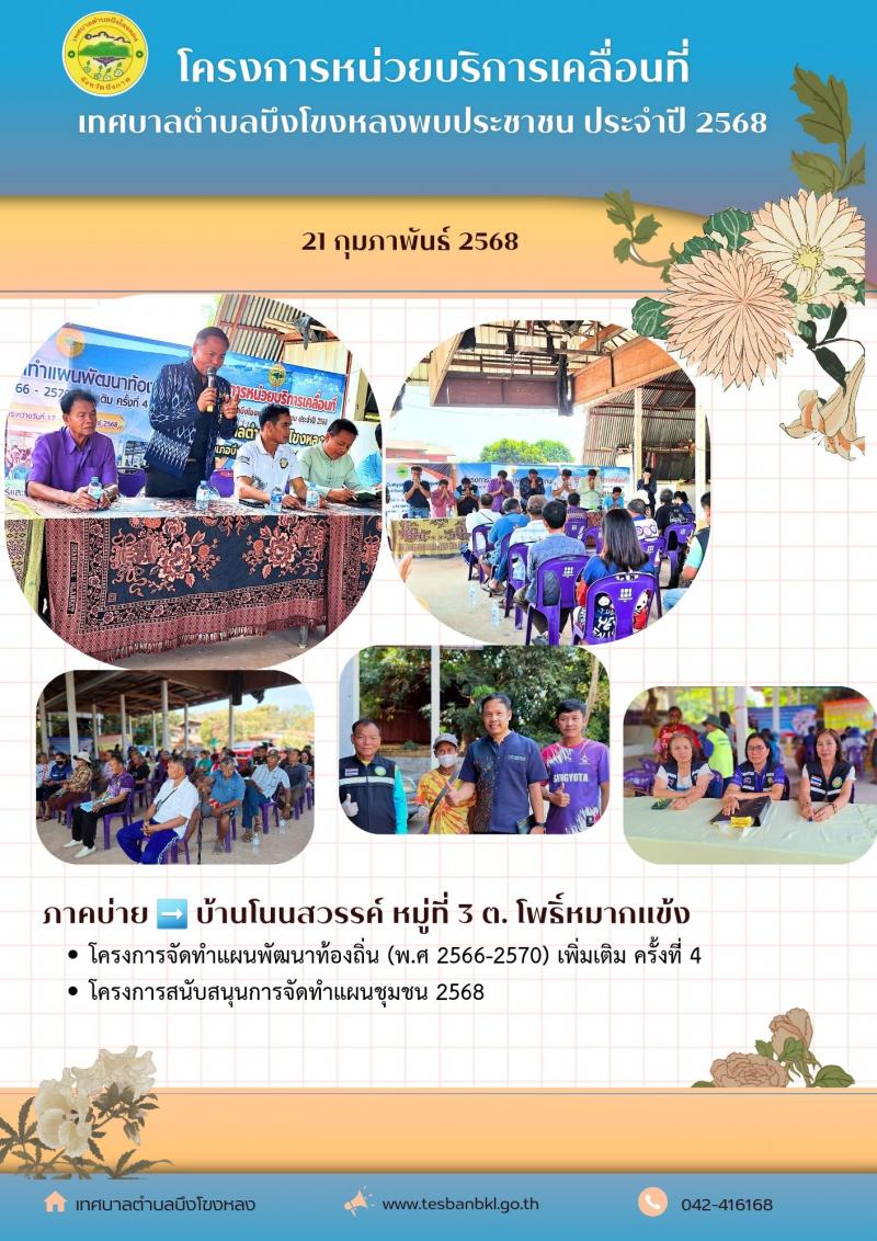 วันศุกร์ ที่ 21 กุมภาพันธ์ 2568 ภาคเช้า บ้านโพธิ์หมากแข้ง หมู่ที่ 1 ต.โพธิ์หมากแข้ง ภาคบ่าย บ้านโนนสวรรค์ หมู่ที่ 3 ต.โพธิ์หมากแข้ง เทศบาลตำบลบึงโขงหลงออกประชาคมเพื่อจัดทำโครงการหน่วยบริการเคลื่อนที่เทศบาลตำบลบึงโขงหลงพบประชาชน ประจำปี 2568, โครงการจัดทำแผนพัฒนาท้องถิ่น (พ.ศ 2566-2570) เพิ่มเติม ครั้งที่ 4, โครงการสนับสนุนการจัดทำแผนชุมชน 2568 นายกเก่ง นายวิทยา ภารจรัส นายกเทศมนตรีตำบลบึงโขงหลง พร้อมคณะผู้บริหาร สมาชิกสภาเทศบาล และพนักงานเทศบาลฯ ได้พบปะพี่น้องประชาชน เพื่อรับฟังปัญหาด้านต่างๆ และออกรับชำระค่าขยะ ค่าภาษีป้าย ฉีดวัคซีนสุนัขและแมว ฯลฯ พร้อมทั้งให้ความรู้ด้านกฎหมาย และประชาสัมพันธ์การเปิดรับสมัครนักเรียนโรงเรียนอนุบาลเทศบาลตำบลบึงโขงหลง ประจำปีการศึกษา 2568